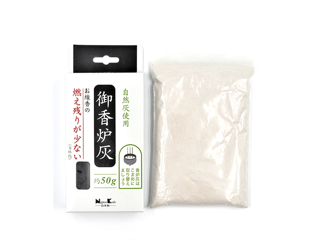 自然灰使用の香炉灰です。お線香の燃え残りが少ないタイプです。3.5寸(直径約10cm)の香炉に適量入ります。この香炉灰は、炭を焼く時に木材を燃焼させてできた灰を主に使用しており、灰の色が微妙に異なることがあります。 商品サイズ:17.3cm×7.4cm×3cm 内容量:約50g メーカー:日本香堂