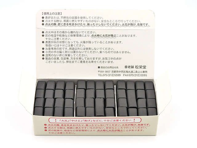 みやこ炭は、お焼香や空薫(そらだき)用として、製造した使いやすい炭です。1粒で約40分燃焼します。 商品サイズ:12cm×5cm×3cm 内容量:小48個(一個のサイズ:2.4cm×1.2cm×0.8cm) 燃焼時間:約40分 形状:筋なし メーカー:松栄堂