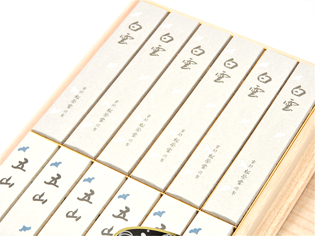 宝永2年創業の香老舗松栄堂のお線香「白雲」と「五山」を詰合せたご進物用(桐箱)になります。白雲は、天空に舞う白雲の清らかさをイメージにし、沈香をベースに高級天然香料で配合した香りのお線香です。五山は、精霊を炎と共に送る京のお盆行事「五山送り火」にちなみ、最高級白檀をベースにしたまろやかで深みのある香りに調合されたお線香です。