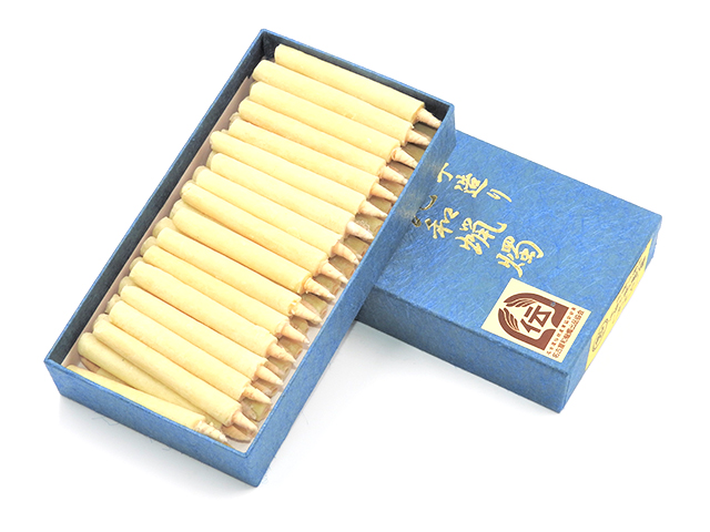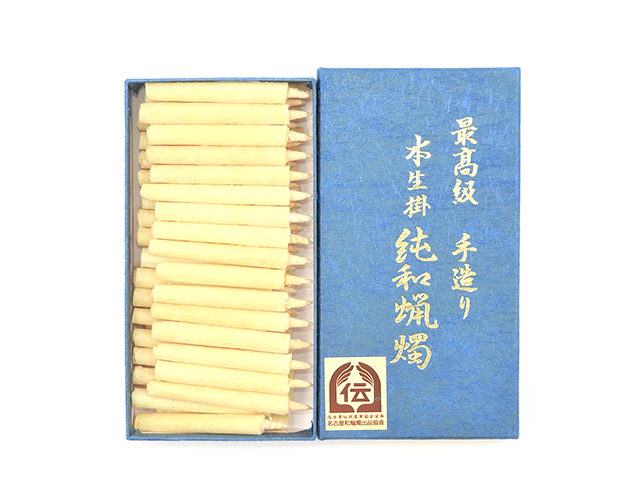 愛知県や名古屋市などから、近年伝統産業として認められた本生掛純和蝋燭です。原料は、すべて国産の天然ハゼの実で出来た木蝋を使用し、芯はい草の中身、長灯芯と和紙で出来ております。鉱物(石油系)、動物の原料は全く入っておりませんので清浄で、油煙は極めて少なく、環境に優しい蝋録です。蝋燭の断面は何度も繰り返し蝋をつけて太くしていく為、木の年輪のようになっております。