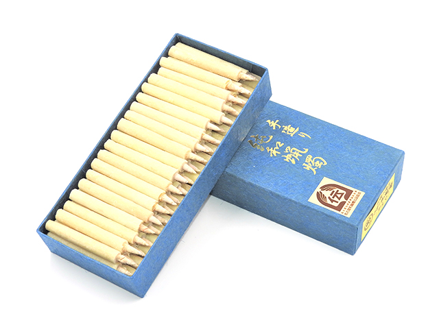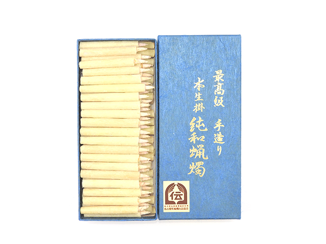 愛知県や名古屋市などから、近年伝統産業として認められた本生掛純和蝋燭です。原料は、すべて国産の天然ハゼの実で出来た木蝋を使用し、芯はい草の中身、長灯芯と和紙で出来ております。鉱物(石油系)、動物の原料は全く入っておりませんので清浄で、油煙は極めて少なく、環境に優しい蝋録です。蝋燭の断面は何度も繰り返し蝋をつけて太くしていく為、木の年輪のようになっております。