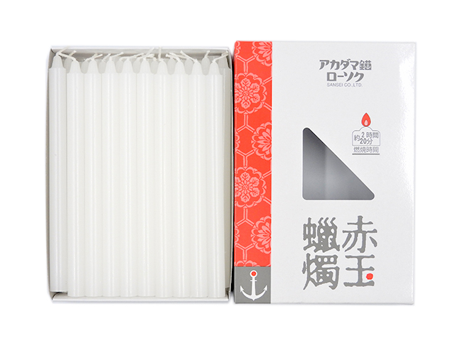 アカダマ錨ローソク・赤玉錨薫香舗の洋ローソク3号(燃焼時間:約2時間20分)です。純度の高いパラフィンを使用し、製法にも独自の研究を重ねてきた洋ローソクで、明治43年イギリスのライジングサン(現:シェル石油)と洋ローソク協力工場として名古屋市(中川区)に創業し、『赤玉錨ローソク』が誕生して以来、愛知県を中心に広く使われております。