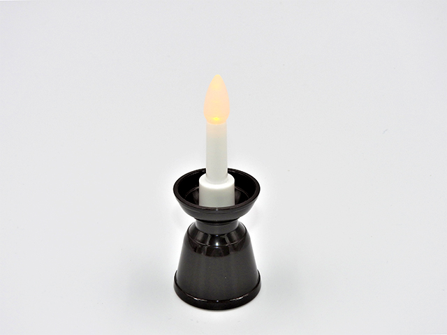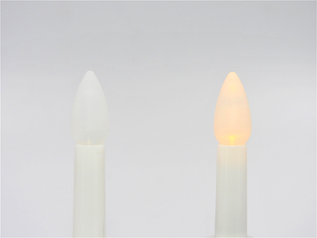 電池式のローソクです。火を使わないので倒れても安心です。ローソク先端部(炎部分)は柔らかい樹脂製です。LEDを使用しているので、球切れしません。LEDが点灯し、ローソクの火のように、ほのかにゆらぎます。タイマー内蔵で、約10分で自動消灯します。