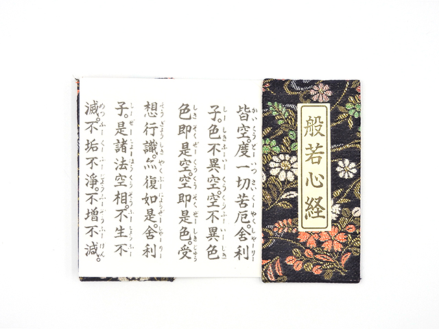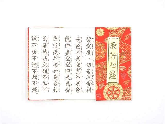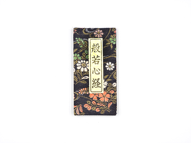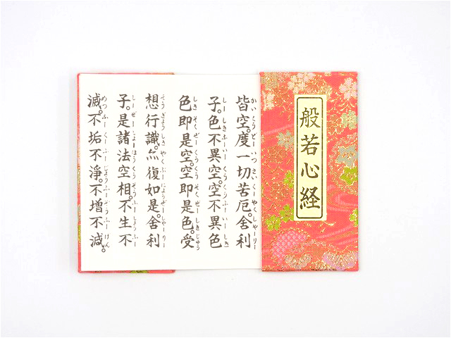 般若心経が書かれたポケットサイズの経本です。表は般若心経、裏は絵心経が書かれています。表紙は緞子表装してあります。*表紙の色柄は品によって多少異なります。赤・オレンジ・ピンク系/紺・青・緑系の2種類からお選びいただきますが、色柄の指定はできません。ご了承ください。 商品サイズ:たて11.2cm×よこ5.4cm 宗派:各宗派 製本:和装本(折本)