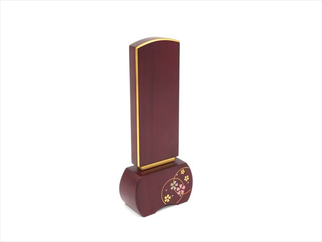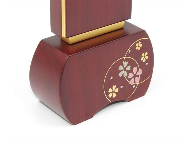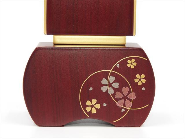 位牌の形が持つ伝統的な美しさを極力シンプルな直線と曲線で表現し、札板の周囲を細い金粉で縁取ることでさりげない優しさと気品が漂う、2012年にグッドデザイン賞を受賞したモダン位牌「優徳」の台座に音や形の蒔絵施されたお位牌「心花(このか)」です。花梨材・パオロッサ材を用いた質感のある木目と落ち着いたローズのカラーです。