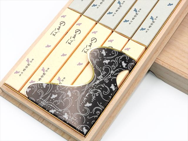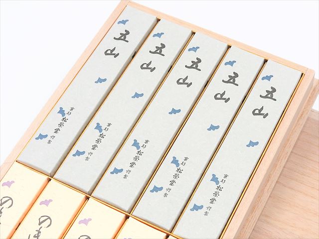 宝永2年創業の香老舗松栄堂のお線香「五山」と「のきば」を詰合せたご進物用(桐箱)になります。五山は、精霊を炎と共に送る京のお盆行事「五山送り火」にちなみ、最高級白檀をベースにしたまろやかで深みのある香りに調合されたお線香です。のきばは、軒の端に咲く清楚な梅の香にも似て、白檀系の優しい香りを漂わせるお線香です。