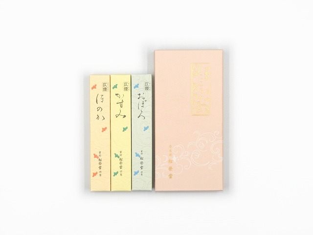 京線香 おぼろ・かすみ・ほのかの小箱セットになります。煙も香りもほのかなお線香の3種類を1箱に収め、ちょっとしたギフトにもおすすめです。