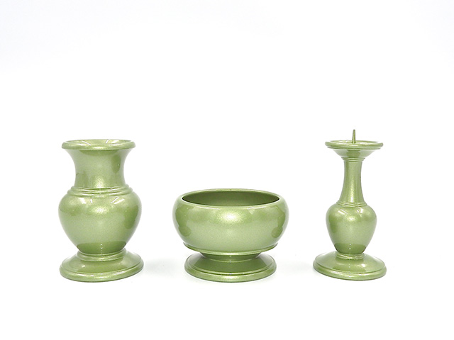 真鍮製の仏具5点セット(仏器、茶湯器、花立、香炉、火立)になります。家具調のお仏壇やモダンなお仏壇に良く合います。